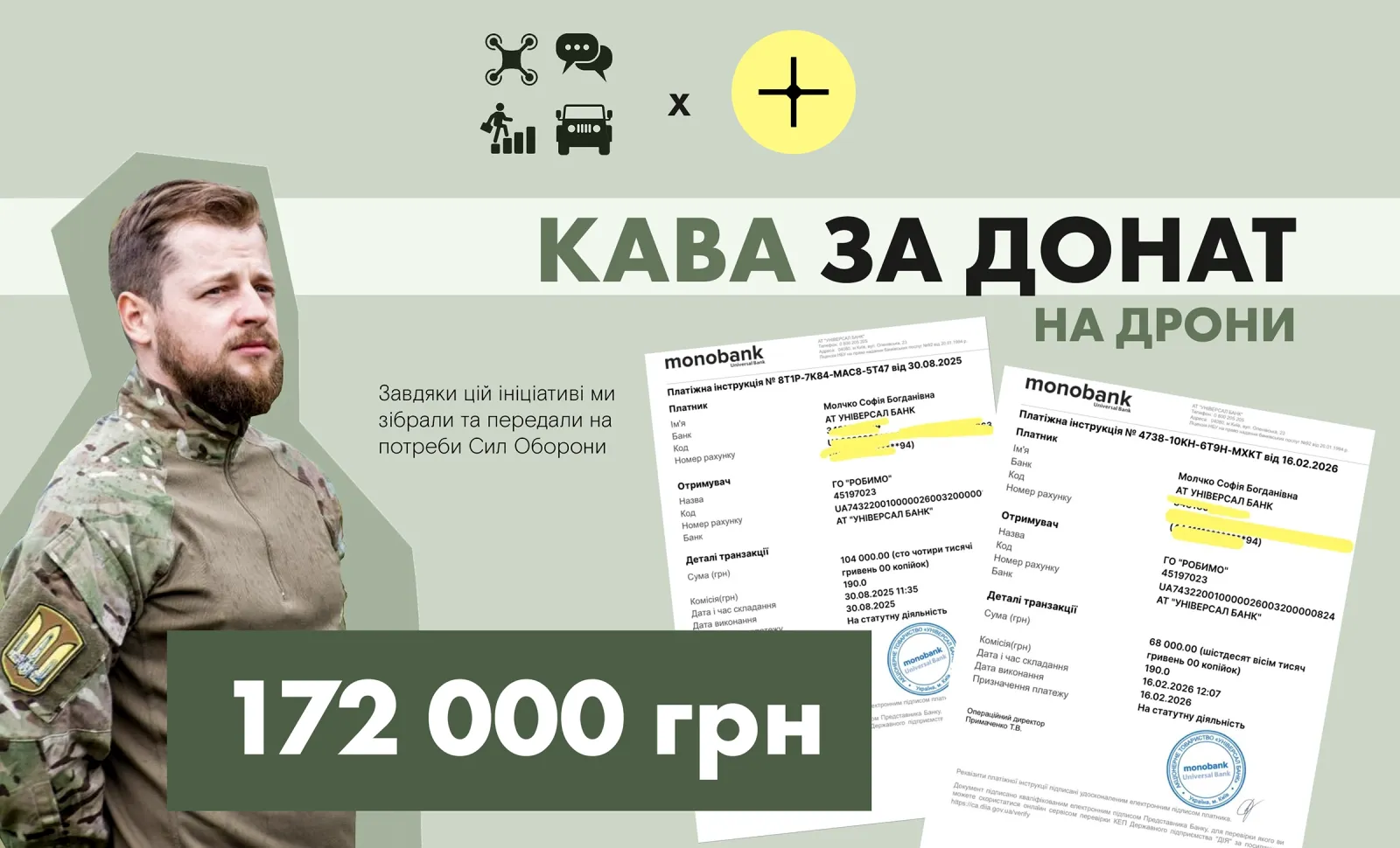 Ми неймовірно пишаємося результатами попереднього етапу ініціативи. Завдяки вашій небайдужості та кожному горнятку кави, протягом 2025 року нам вдалося зібрати та передати ГО «Робимо» 172 000 гривень. Ці кошти перетворилися на реальну допомогу на фронті, і ми не плануємо зупинятися на досягнутому.