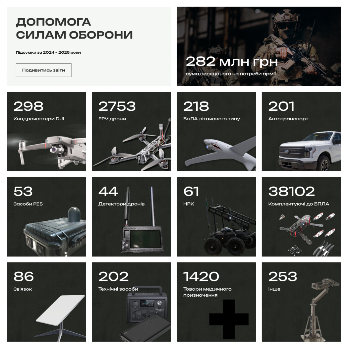 За 2024-2025 рік фонд передав війську майна на 282 000 000 гривень.