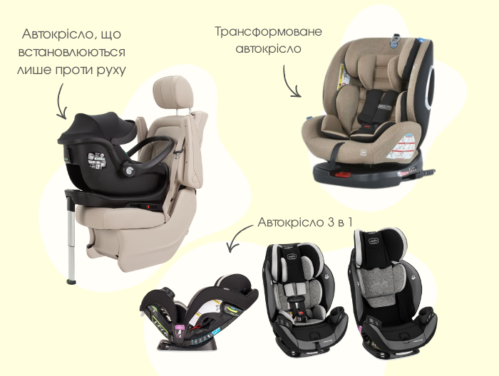 Автокрісла є різні. Тип сидіння, який потрібен вашій дитині, залежить від кількох факторів: вік, зріст та потреби розвитку дитини.