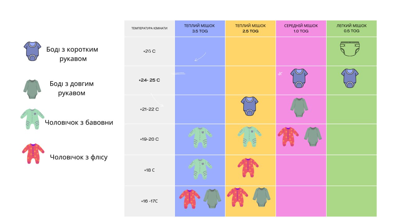 На картинці ви зможете зорієнтуватись, як одягати дитину на сон вночі, залежно від характеристик спального мішка:
