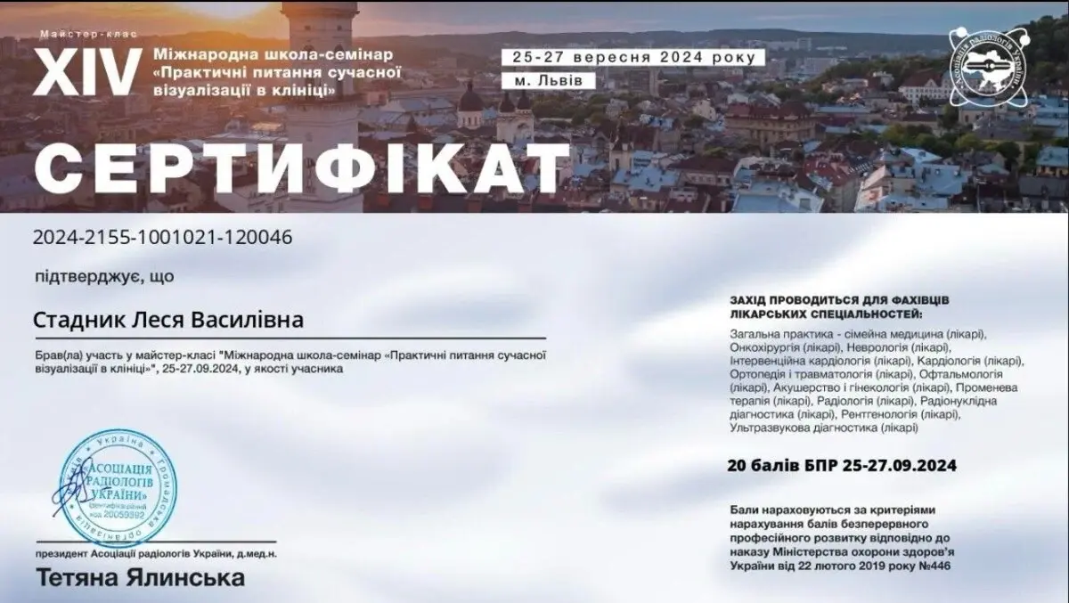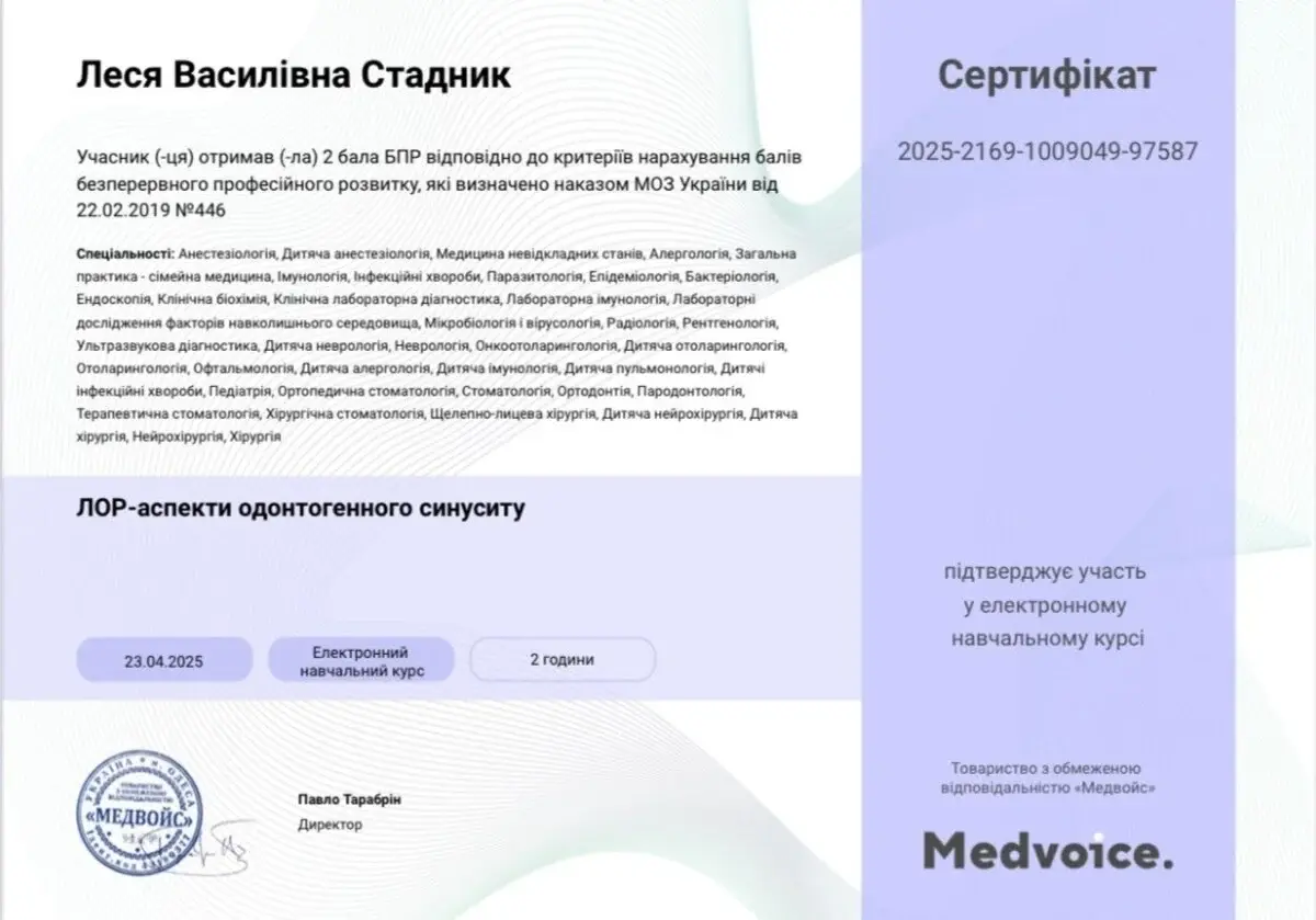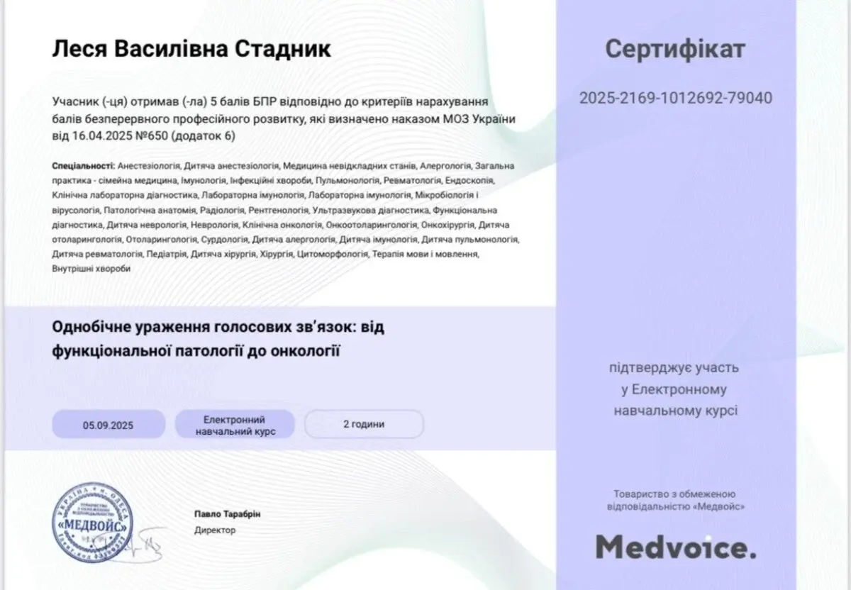 2025 рік - участь у майстер-класі «Сучасні ендоскопічні технології в отоларингології» м.Ужгород.