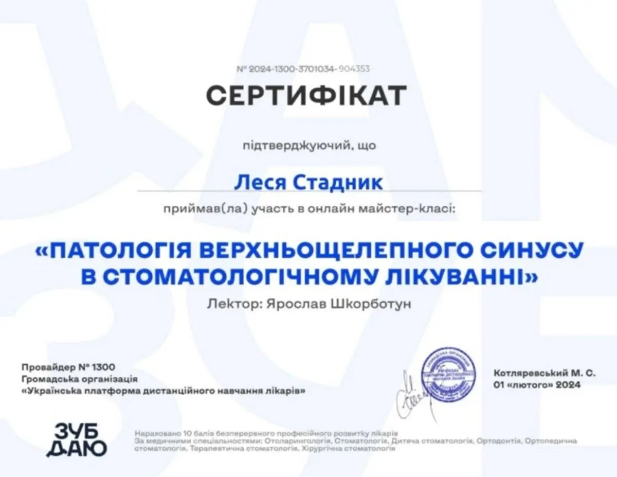 2024 рік - участь у майстер-класі «Сучасний погляд на надання хірургічної допомоги пацієнтам з патологією носа та приносових синусів», м. Тернопіль.