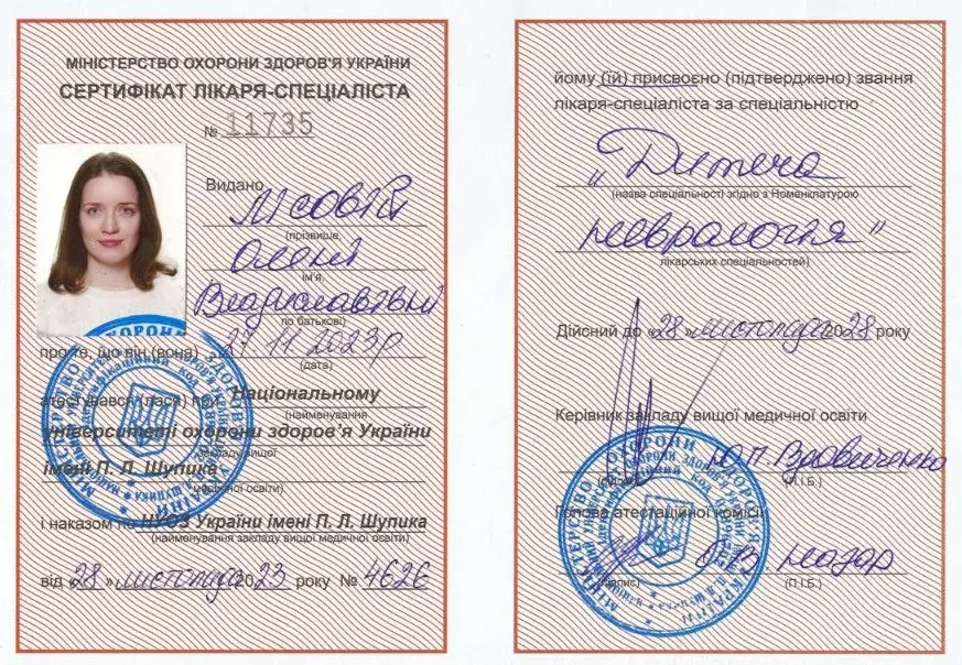 - 2024 р. - Спеціалізація «Дитяча неврологія» на базі Національний університет охорони здоров'я україни імені П. Л. Шупика