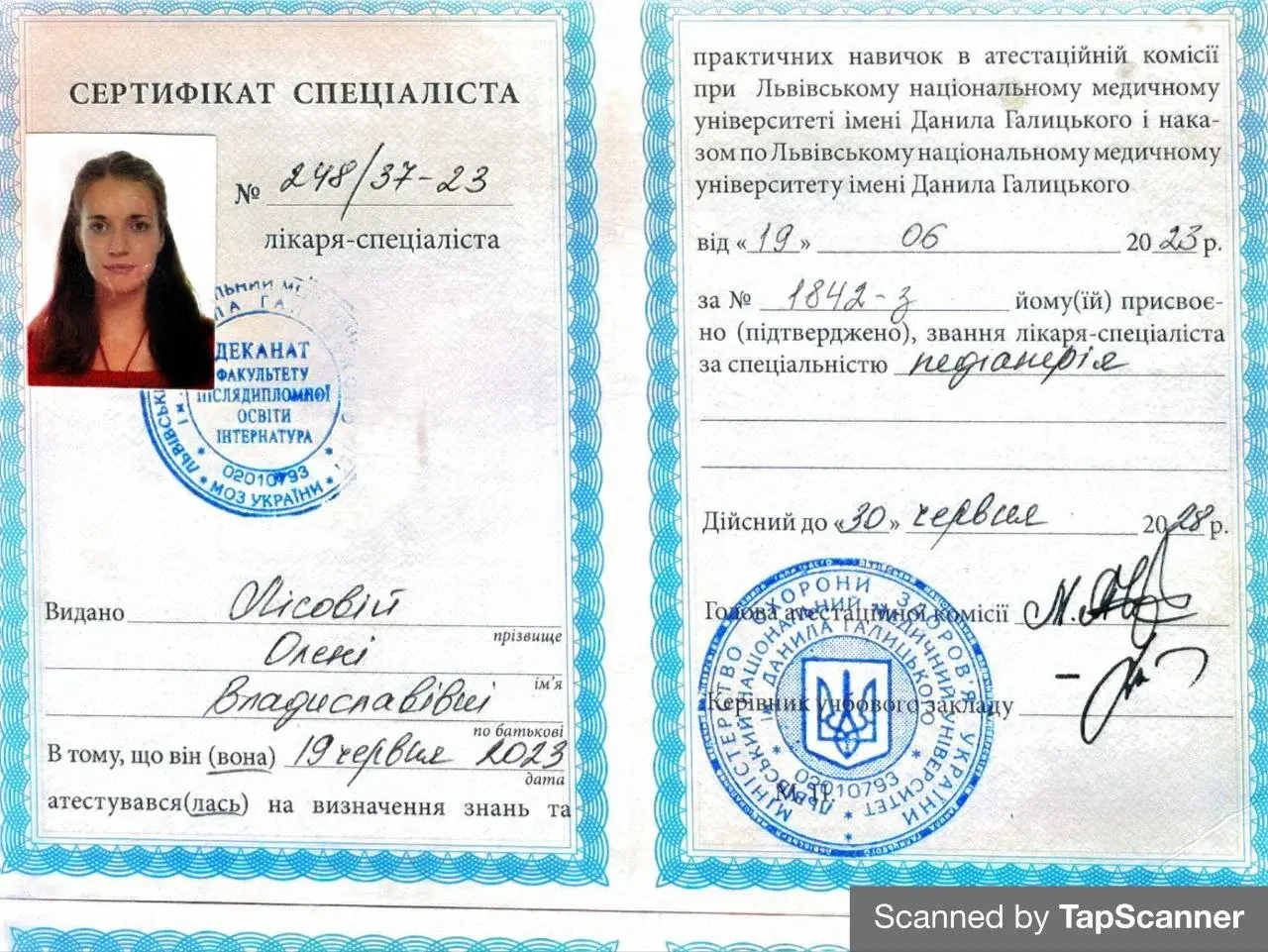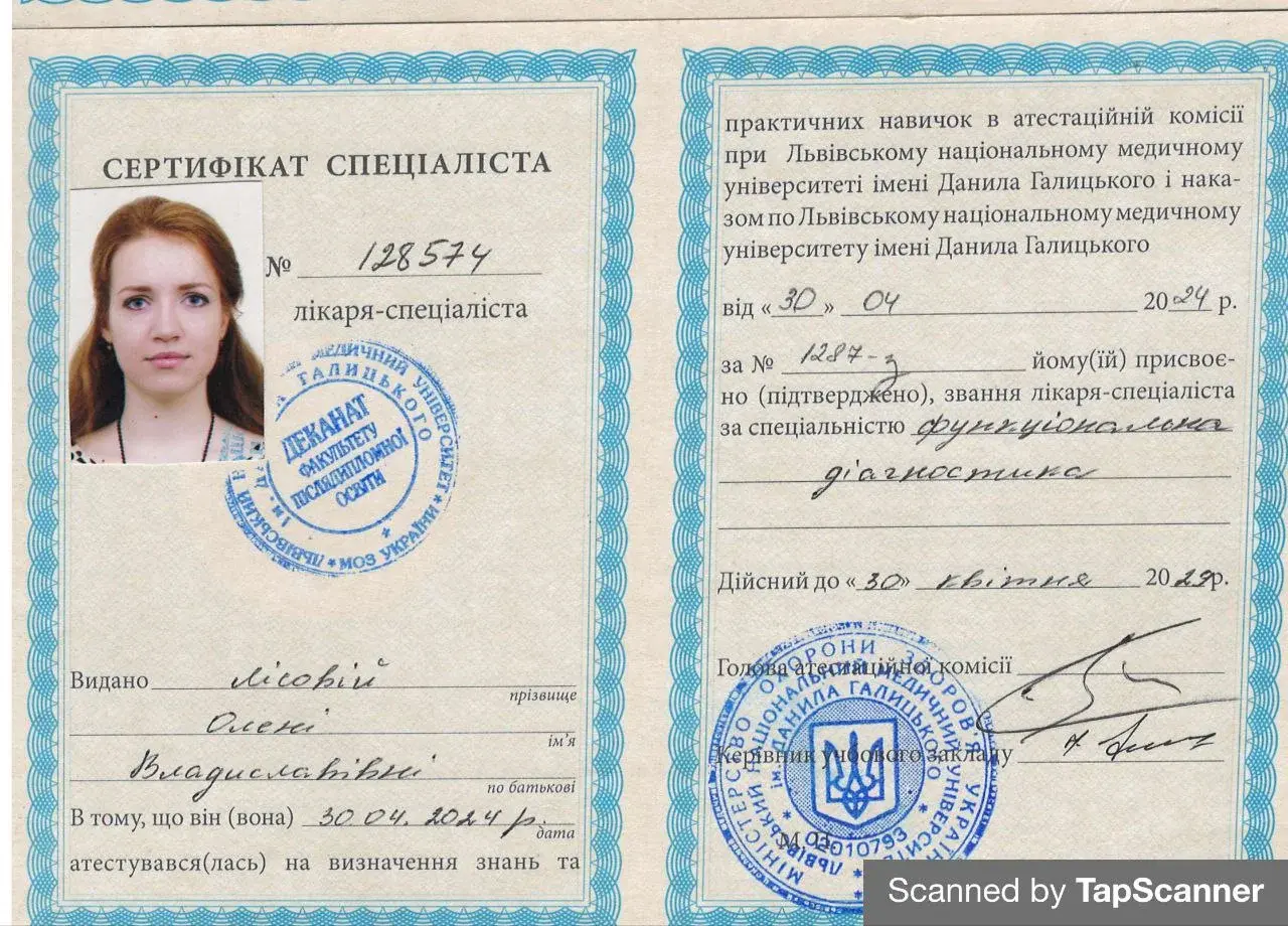 - 2024 р. - Спеціалізація “ Функціональна діагностика” на базі Львівського національного медичного університету