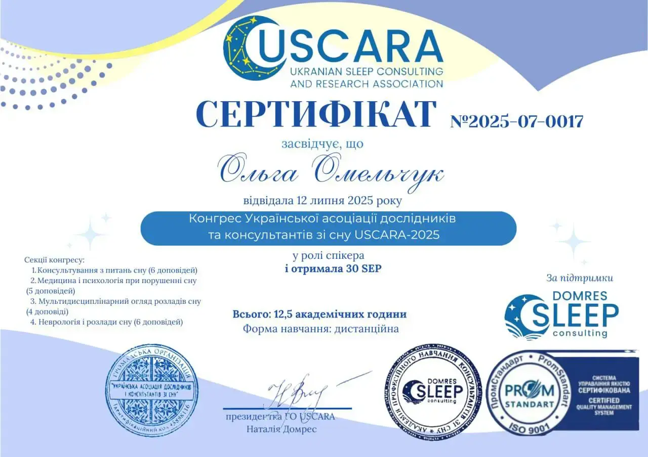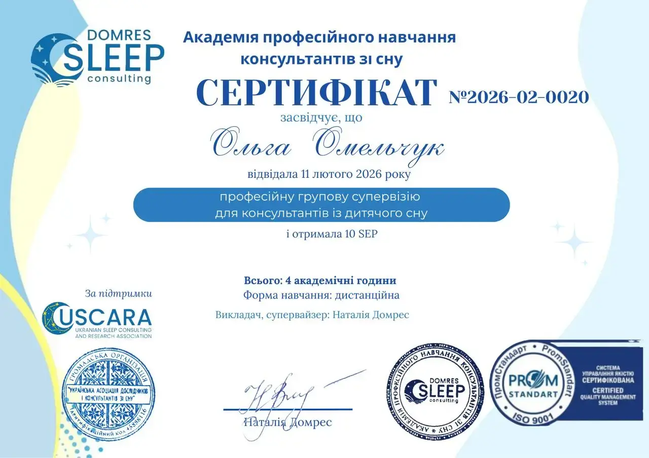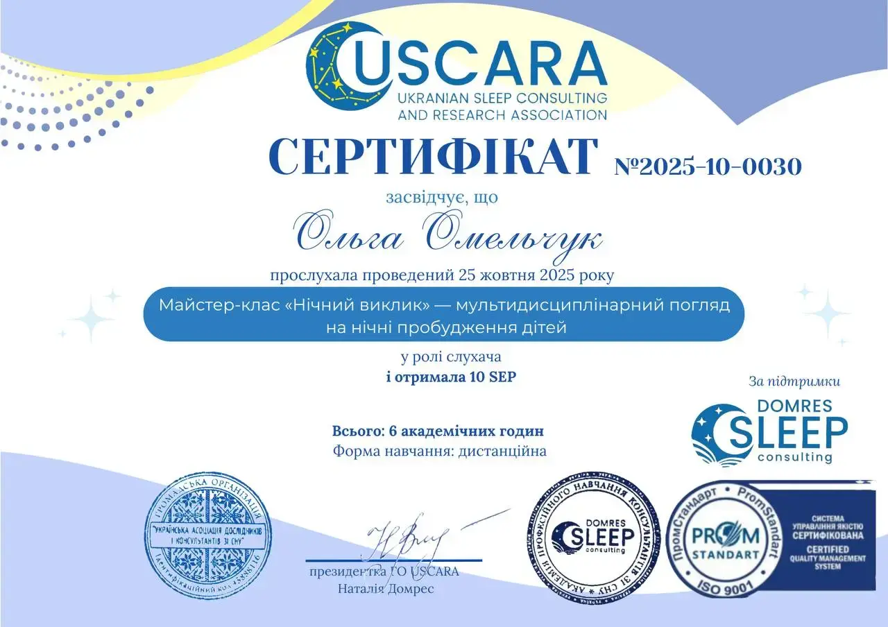 - 2025 рік - навчання за програмою мультидисциплінарний професійний курс "консультант із дитячого сну" Академії професійного навчання консультантів зі сну