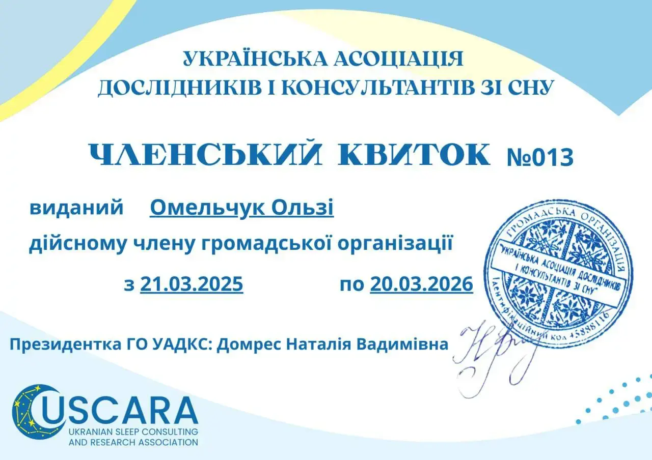 - 2024 рік - Випуск європейської асоціації медицини ESMANA, сертифікований консультант зі сну