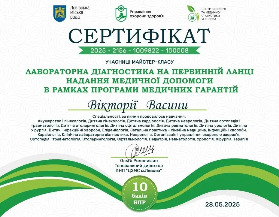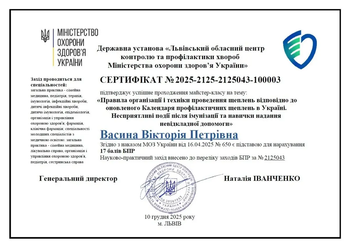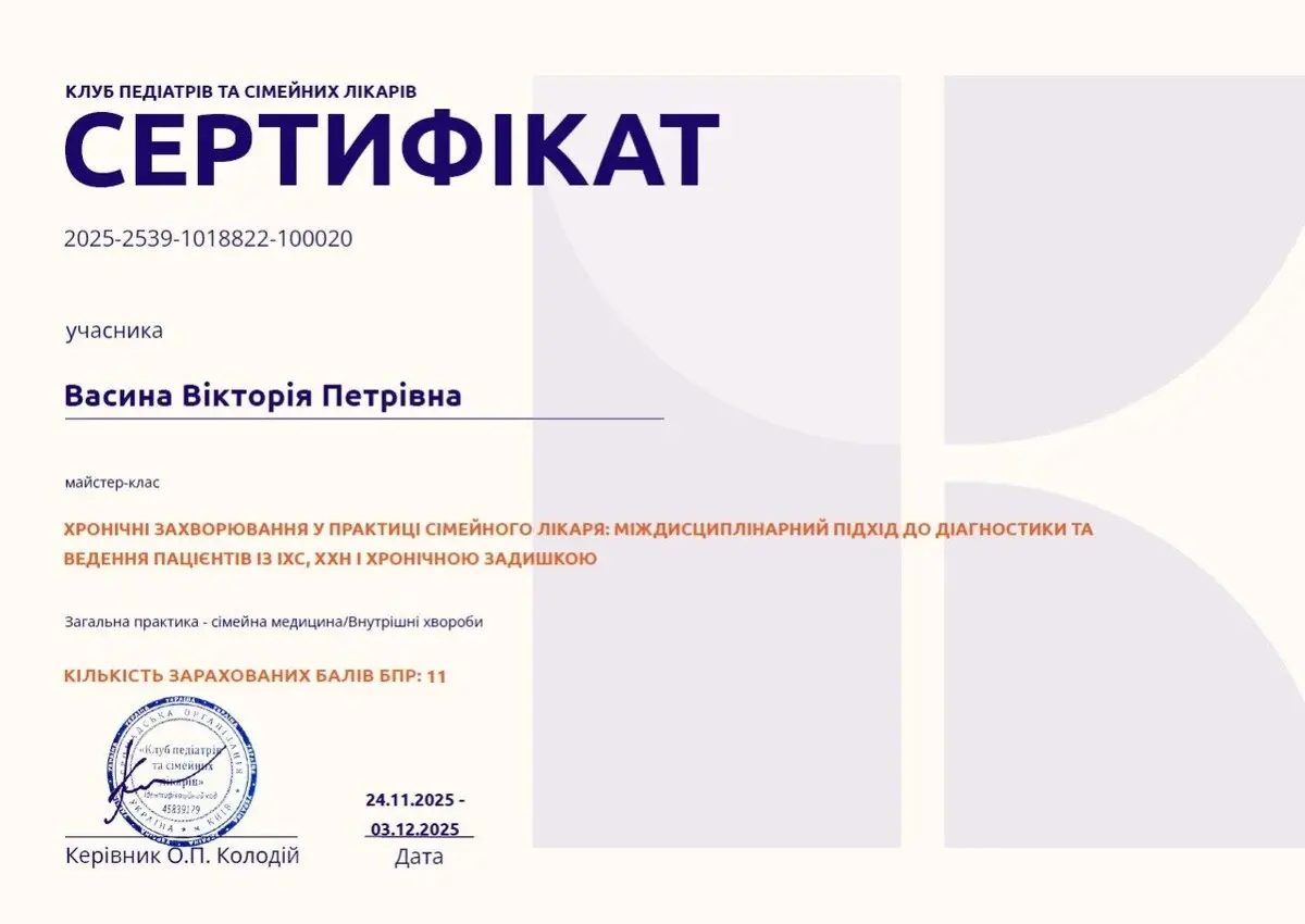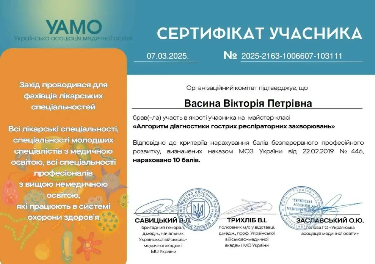 Васина Вікторія Петрівна - сімейна лікарка медичного центру Medialt, учасниця міжнародних та всеукраїнських конференцій, наукових семінарів.