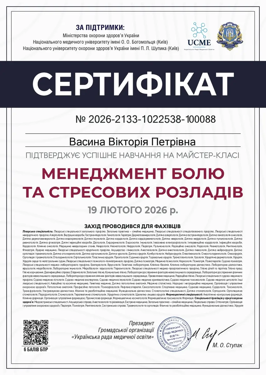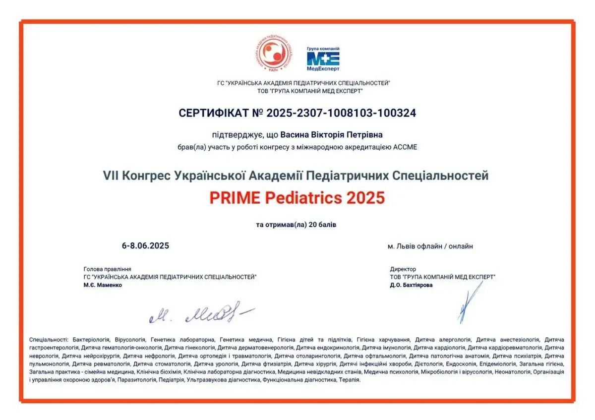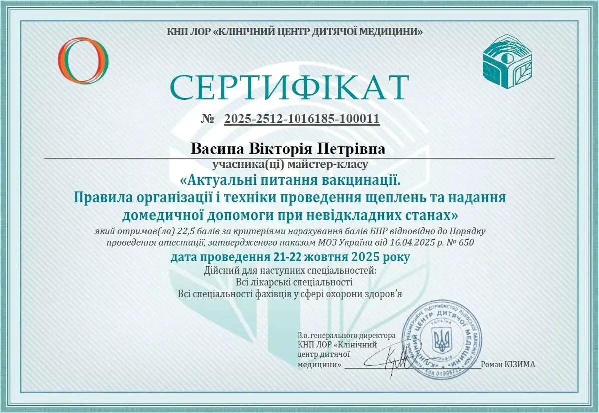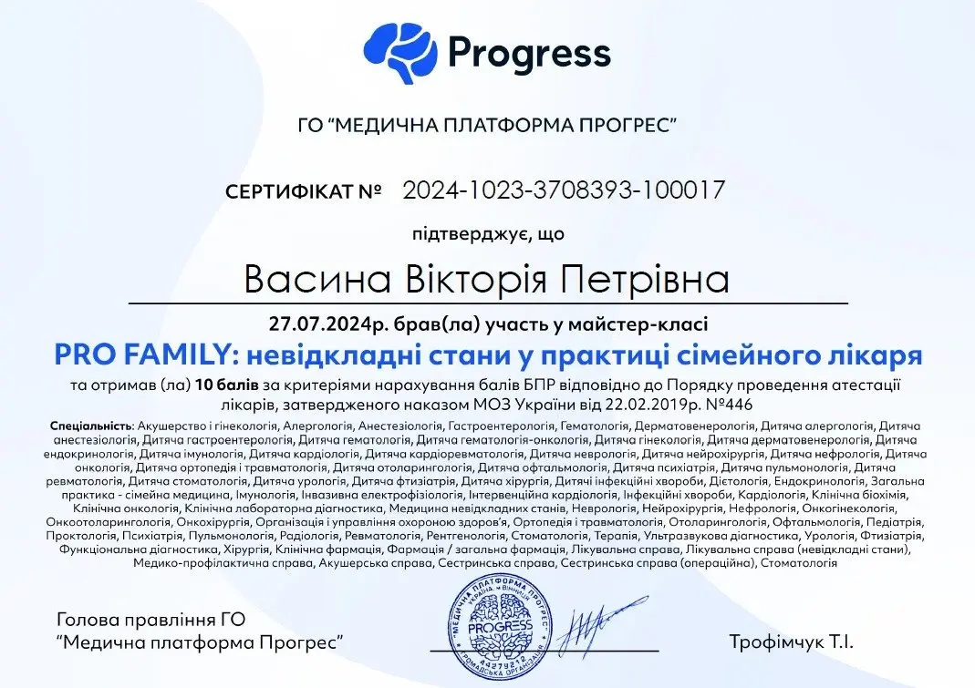 Васина Вікторія Петрівна - сімейна лікарка медичного центру Medialt, учасниця міжнародних та всеукраїнських конференцій, наукових семінарів.