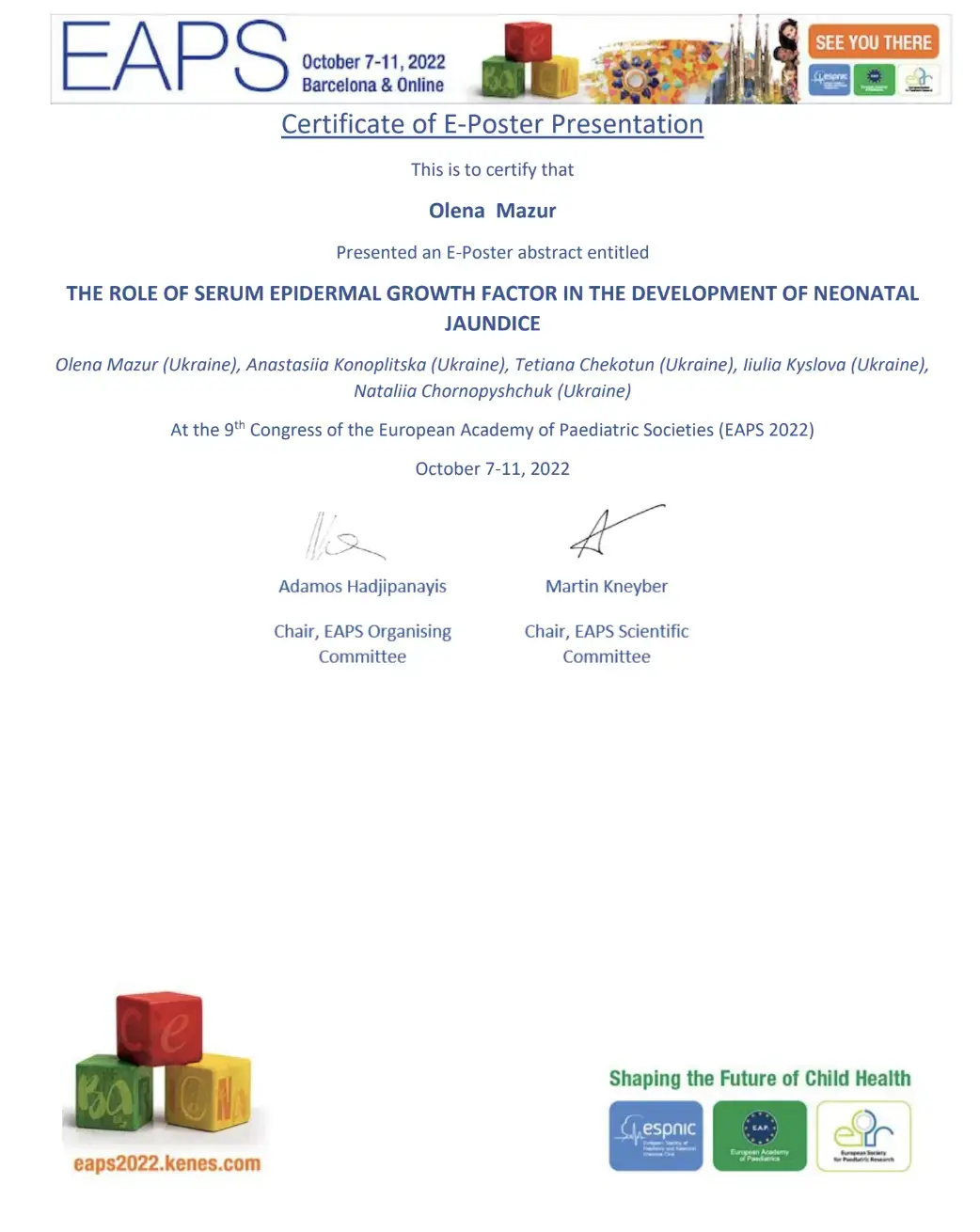- 2010 р. - дисертація "Рання дiагностика гiпоксично-iшемiчного ушкодження центральної нервової системи у недоношених дiтей та профiлактика несприятливих наслiдкiв".