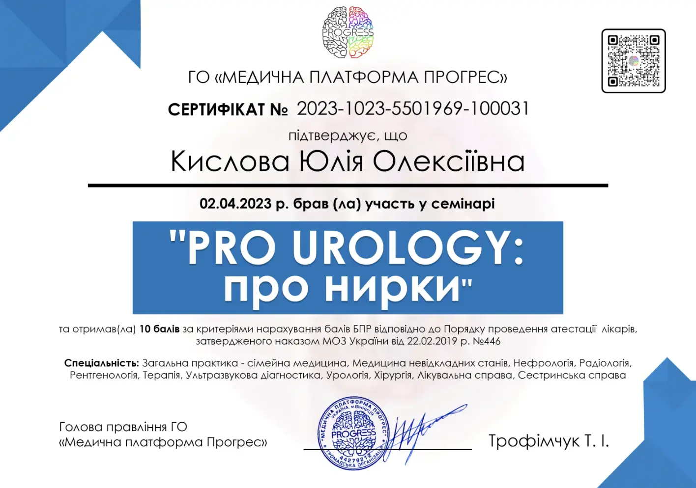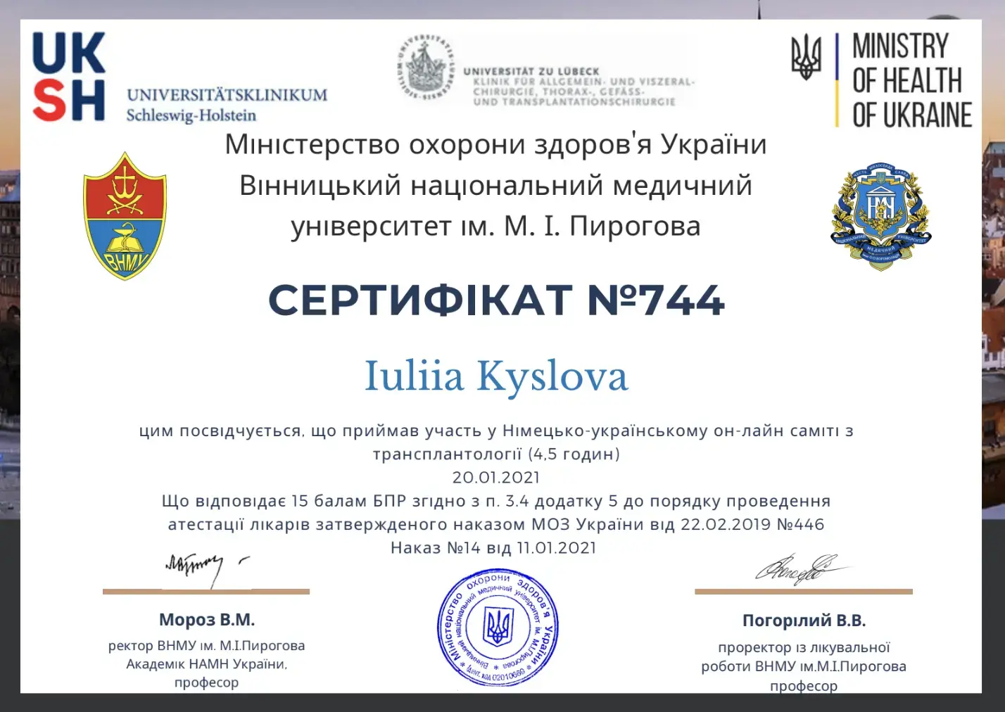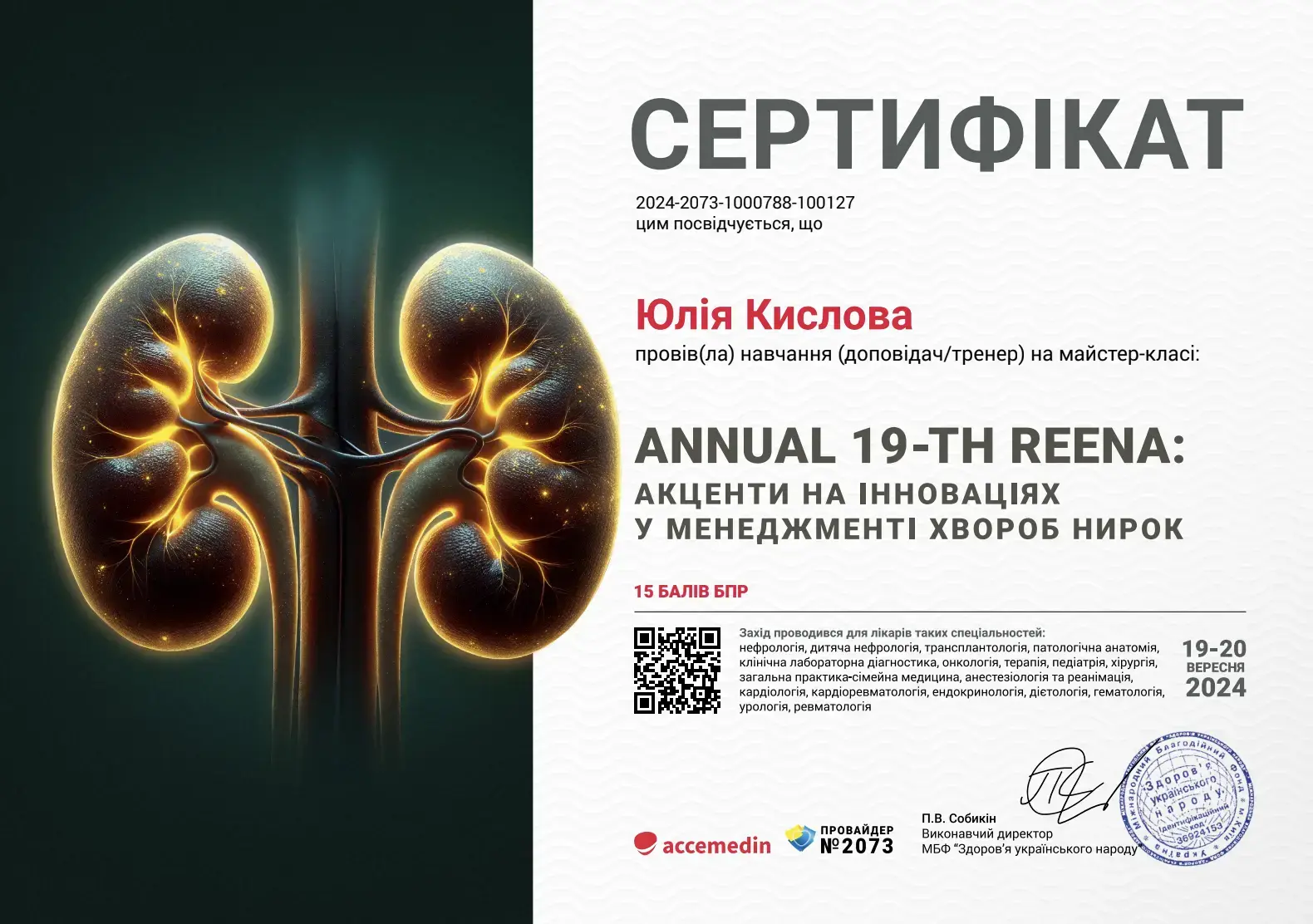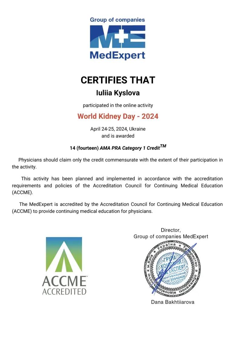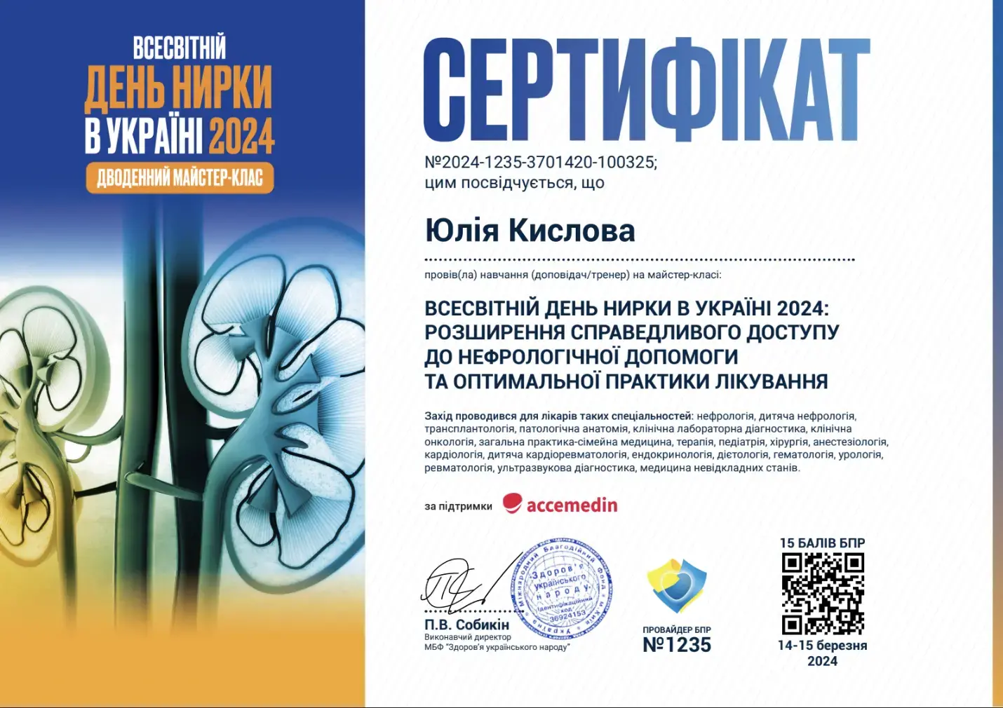 - 2017 р., Національний університет охорони здоров'я України імені П. Л. Шупика, спеціалізація "Дитяча нефрологія"