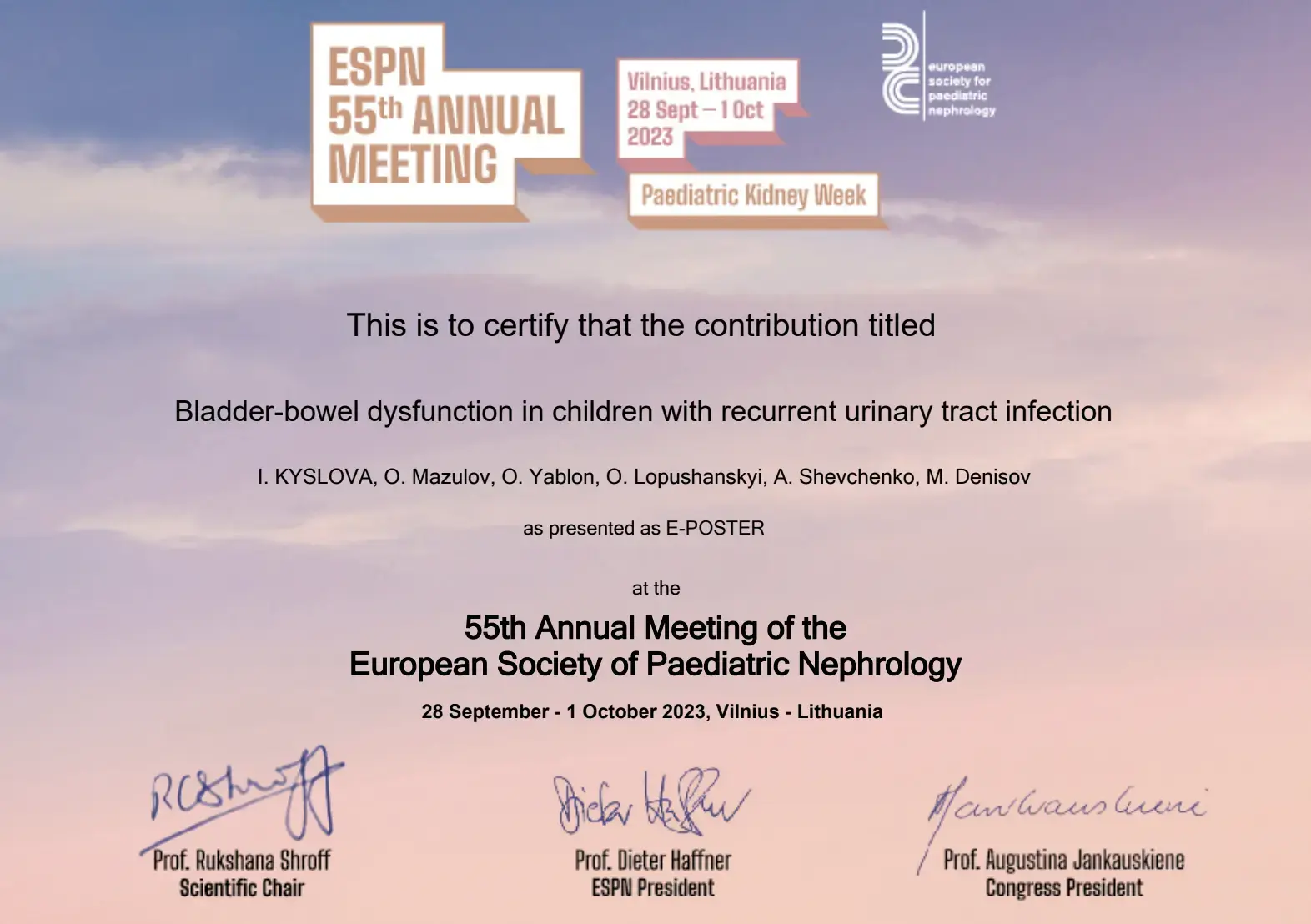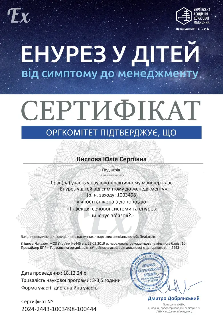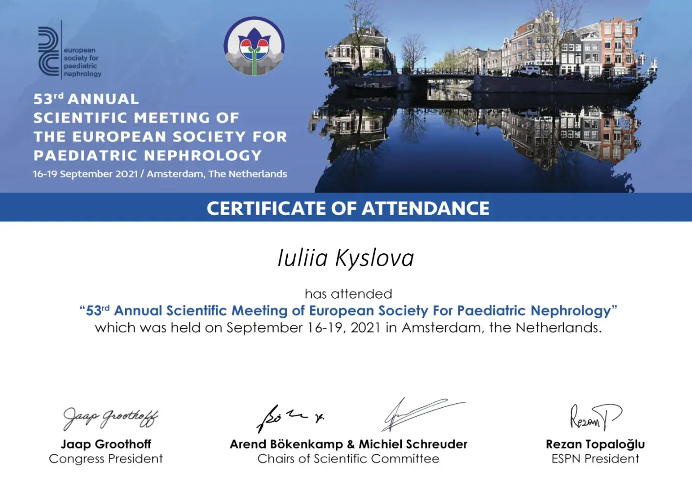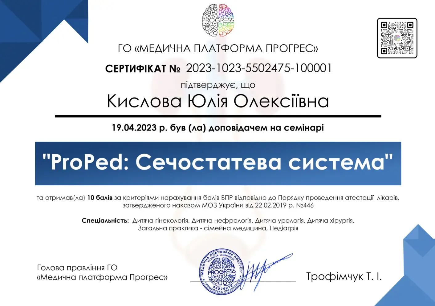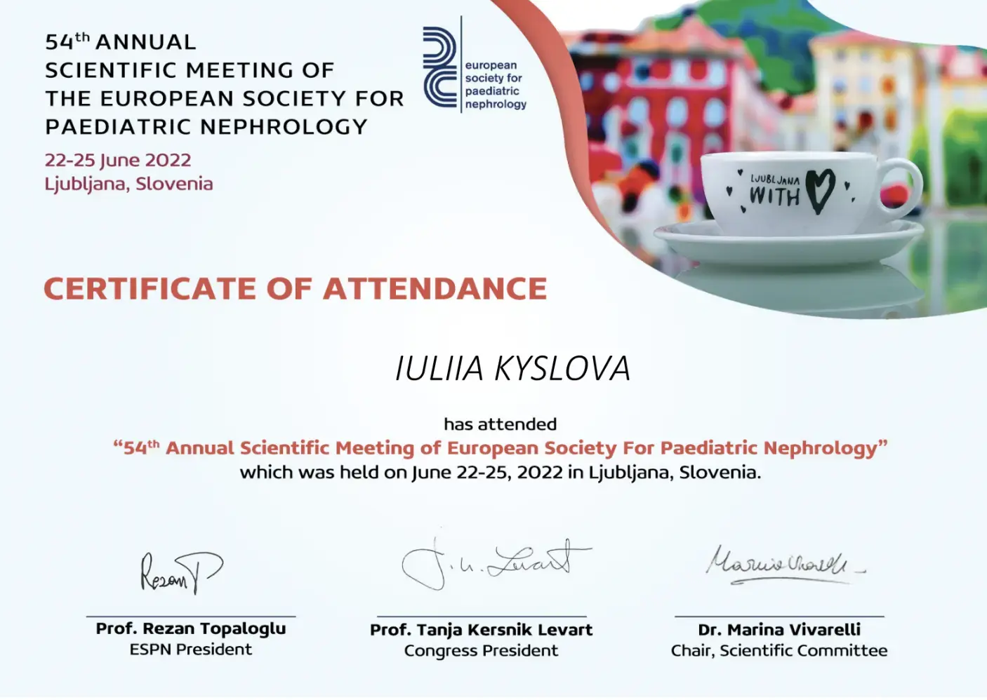 - 2017 р., Національний університет охорони здоров'я України імені П. Л. Шупика, спеціалізація "Дитяча нефрологія"